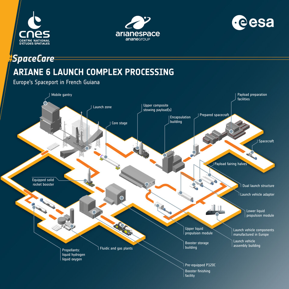Chiaramente visibili dallo spazio, le strutture presentano notevoli strutture complesse sopra e sotto terra appositamente progettate per supportare i lanci di Ariane 6 nel prossimo decennio. È l'orgoglioso traguardo dell'agenzia spaziale francese, CNES - capocommessa dell'ESA per lo sviluppo della base di lancio, e dei suoi partner industriali europei.