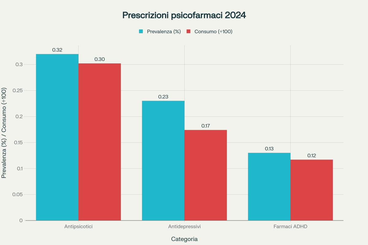 Circa 4,6 milioni di bambini e adolescenti in Italia hanno ricevuto almeno una prescrizione farmaceutica nel 2024, equivalente al 50,9% della popolazione pediatrica. Gli psicofarmaci rappresentano tuttavia solo l'1% del consumo totale di farmaci in età pediatrica, nonostante l'aumento registrato. Le categorie prevalenti rimangono gli anti-infettivi sistemici, i farmaci per l'apparato respiratorio e i preparati ormonali sistemici.