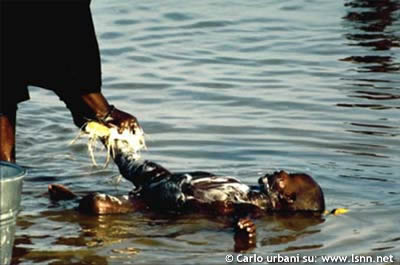 Il loro contatto con l’acqua del fiume è importante. È forse l’unico gioco disponibile e offre un piacevole ristoro all’afa soffocante. E poi correre nei campi non è, forse, così raccomandabile ... in un paese con una delle più alte concentrazioni al mondo di mine antiuomo! Poco più vicine alla riva le sorelle più grandi, sedute sulle rocce semiaffioranti, a lavare i poveri panni o intente a sciacquare gli umili utensili domestici. E sulla riva qualche bambino più piccolo che fa la cacca nel fiume. Una scena normale lungo un fiume tropicale, ma questo è il ritratto della trasmissione della schistosomiasi. Bambini infetti fanno la cacca, nella quale probabilmente ci sono uova di schistosoma. Poco lontano le rocce ospitano la conchiglia che fa diventare infettante la larva, e nella stessa zona altri che nuotano, e il cerchio si chiude. Incuriositi dal nostro arrivo i bambini escono all’asciutto, mostrando i loro enormi ventri, costellati da tante piccole cicatrici. Ci accompagnano silenziosi lungo il sentiero che sale al villaggio.
